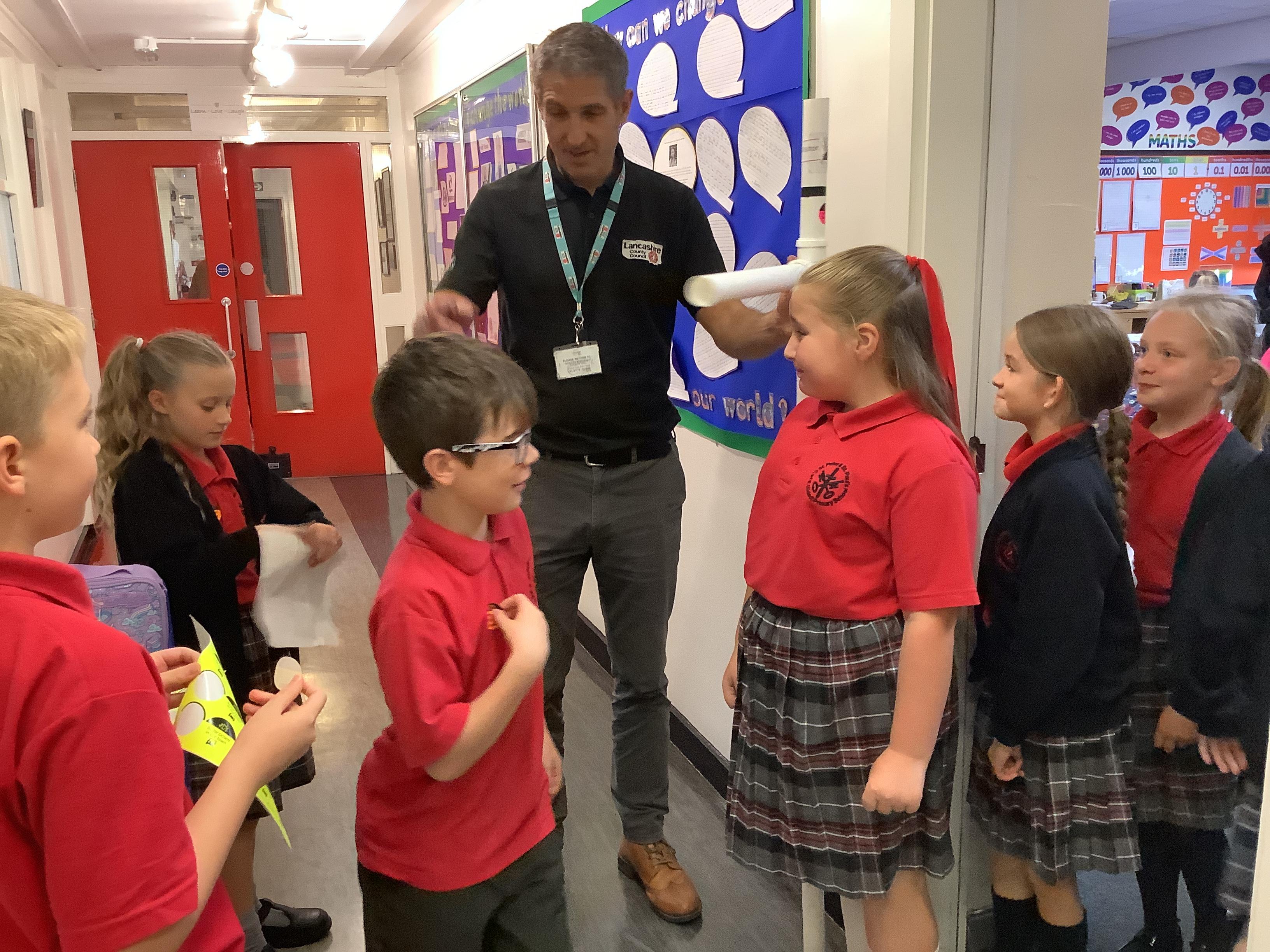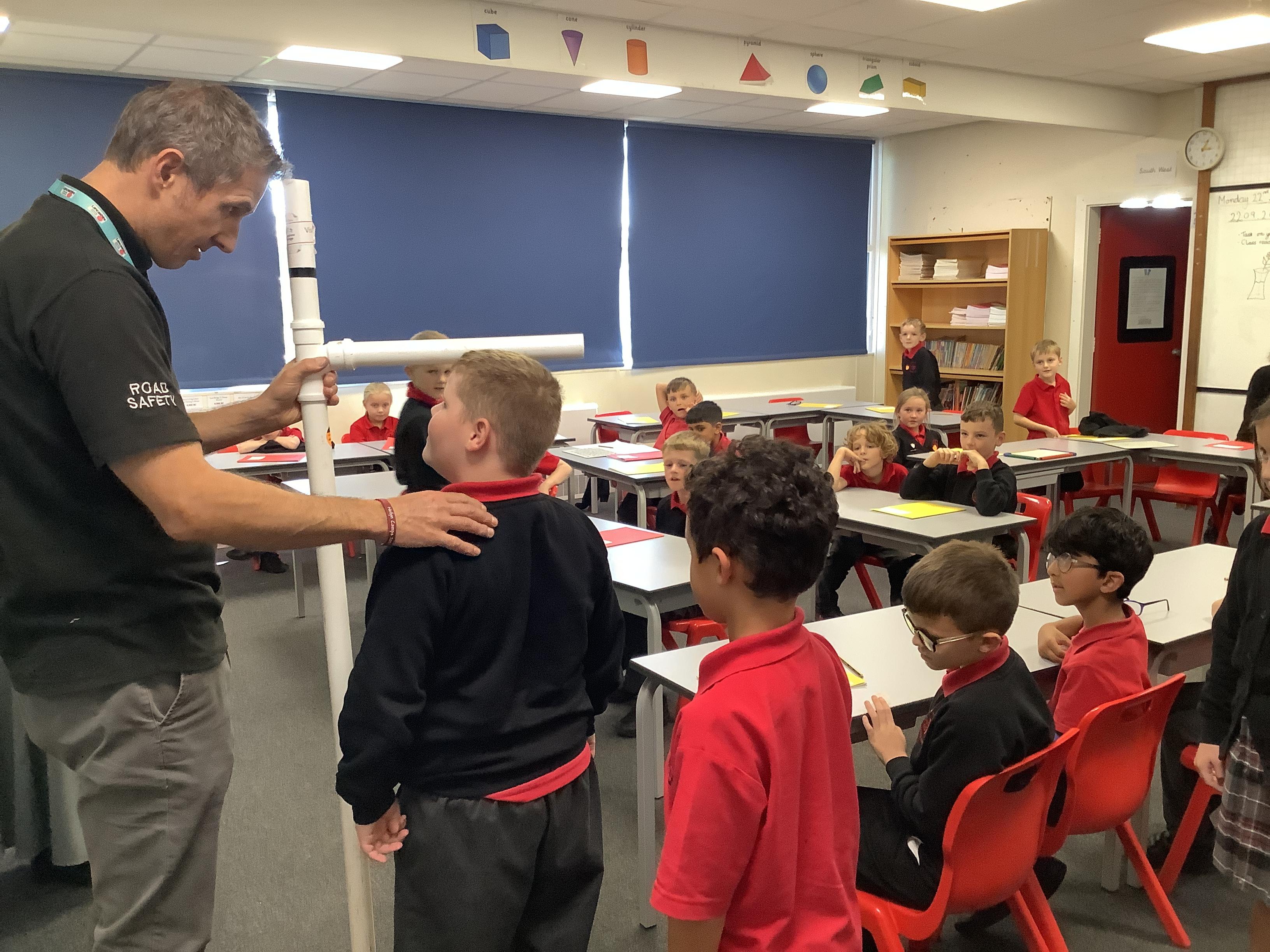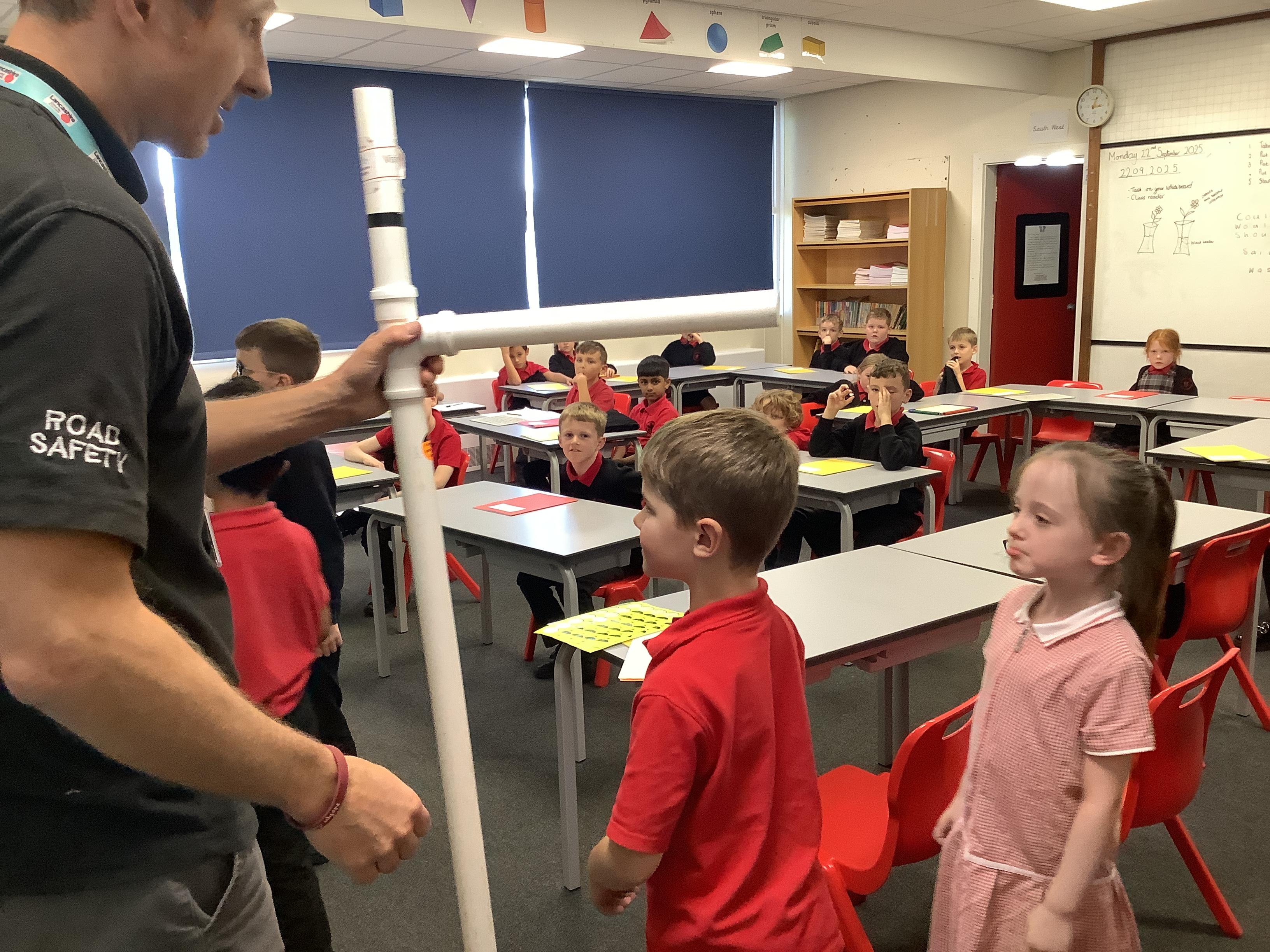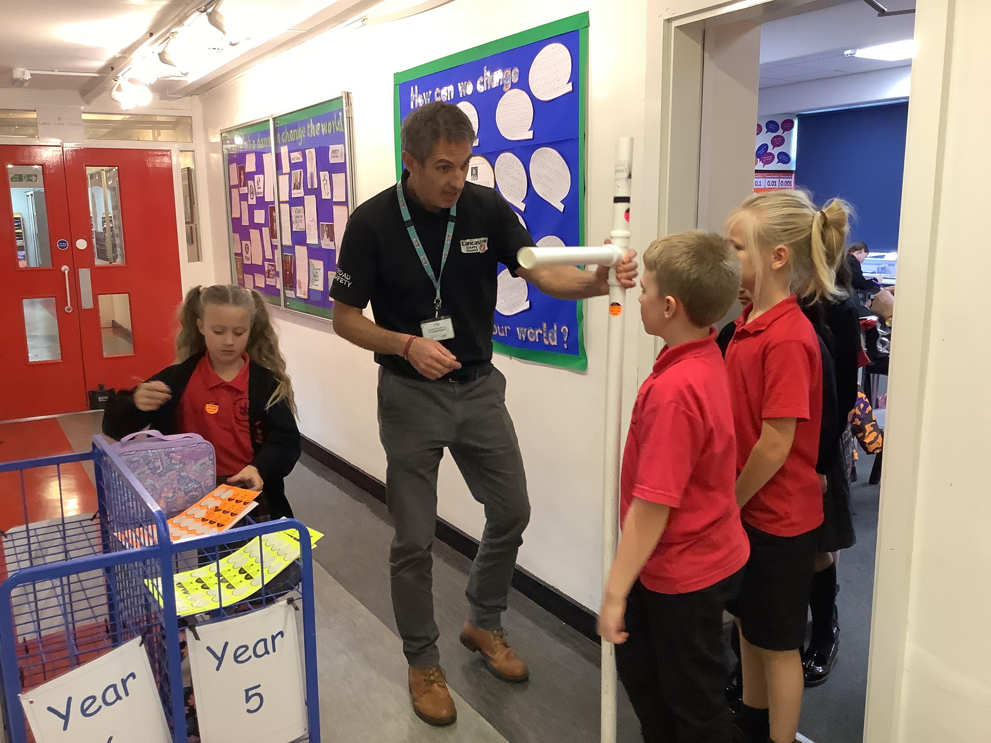 Danny, one of the road safety officers from Lancashire County Council, has been into school to speak to KS2 about the legal requirements of having to use a booster seat when travelling in a car. All children have been measured and if they are less than 135cm have been given an orange sticker to show parents they still need to use a booster seat due to their height.