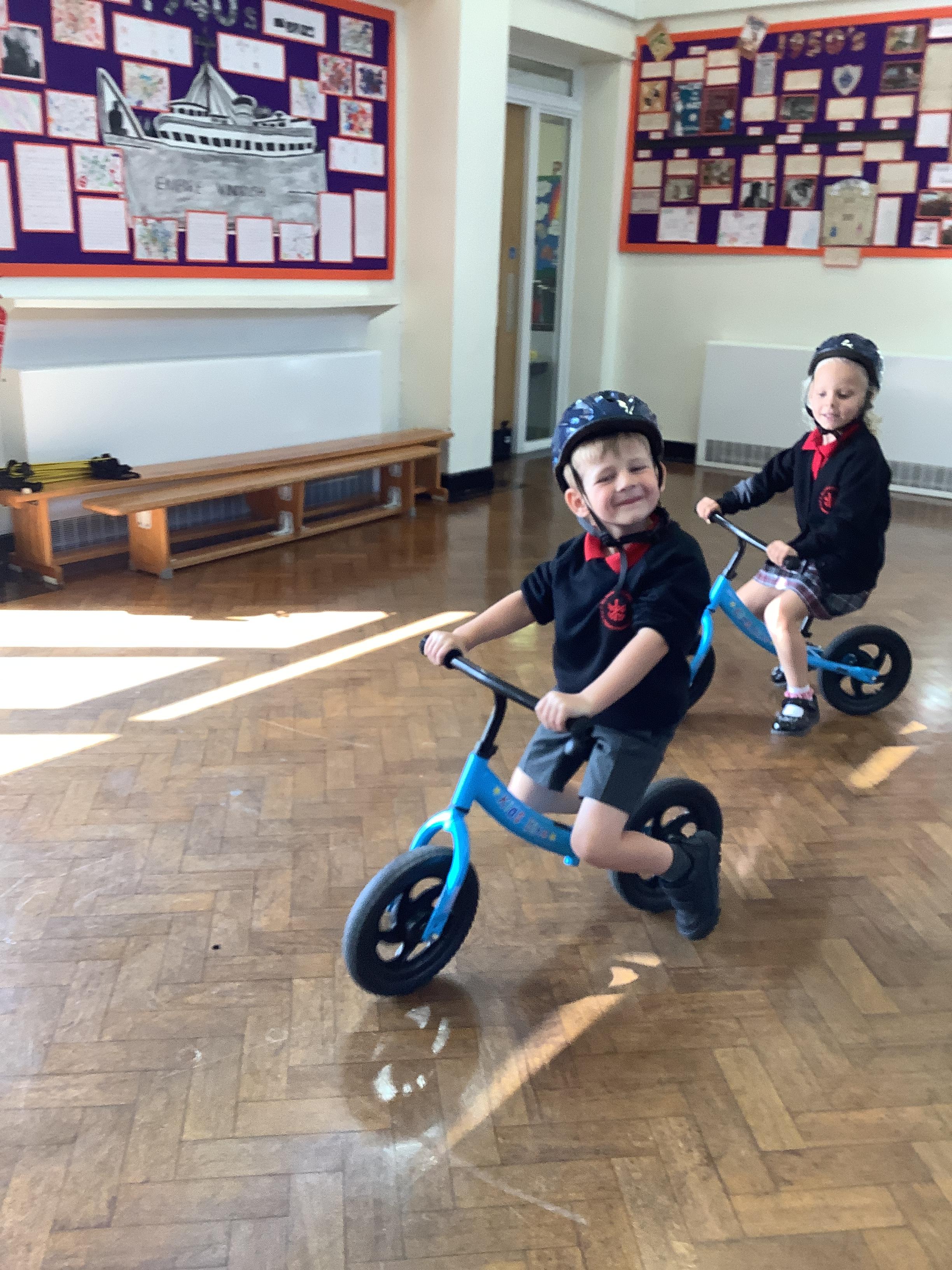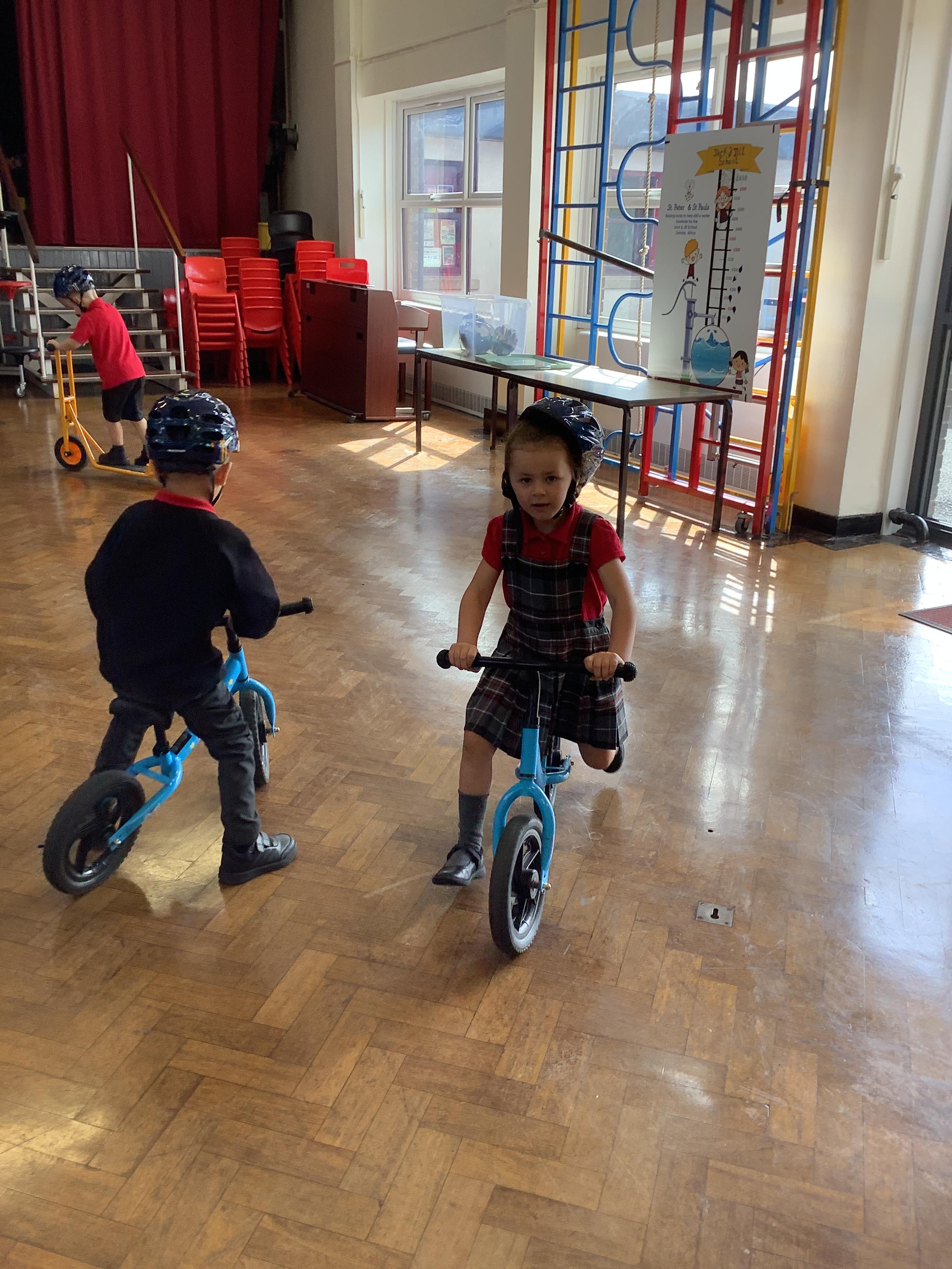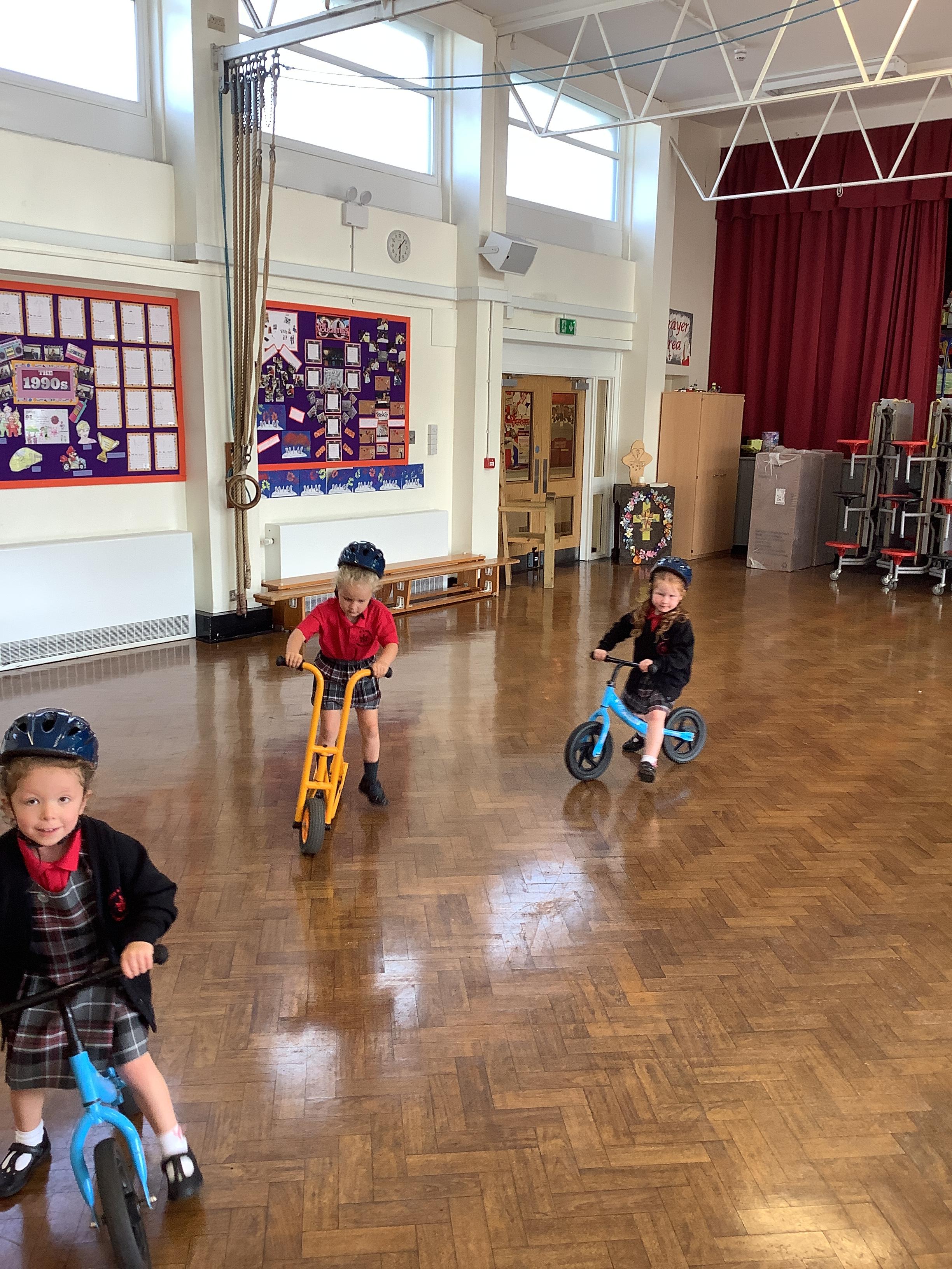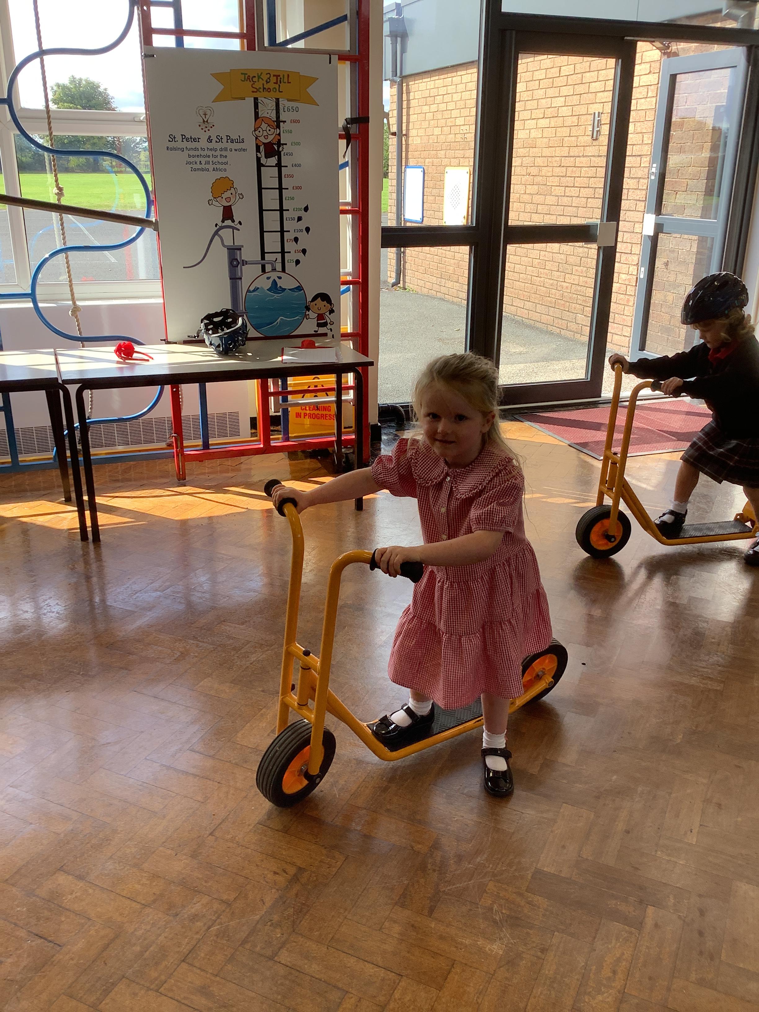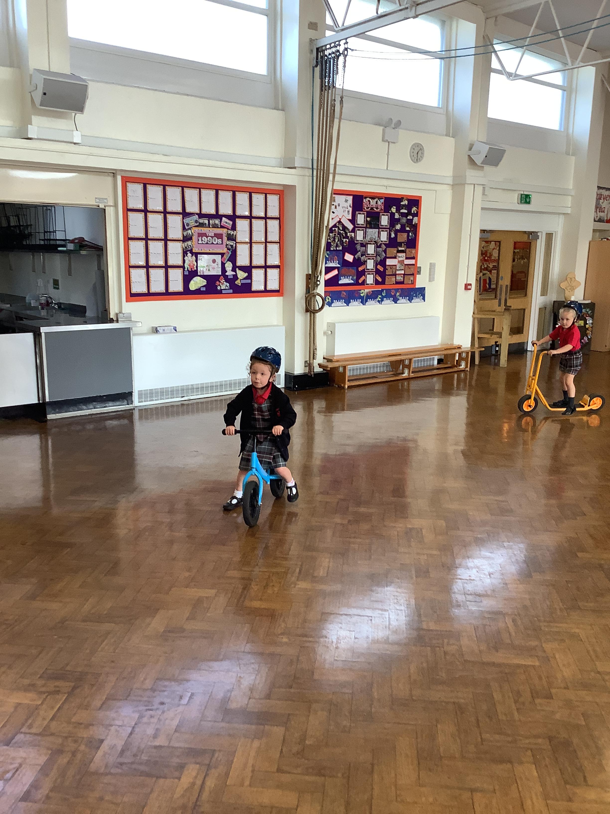 Practising balancing on the bikes and scooters.