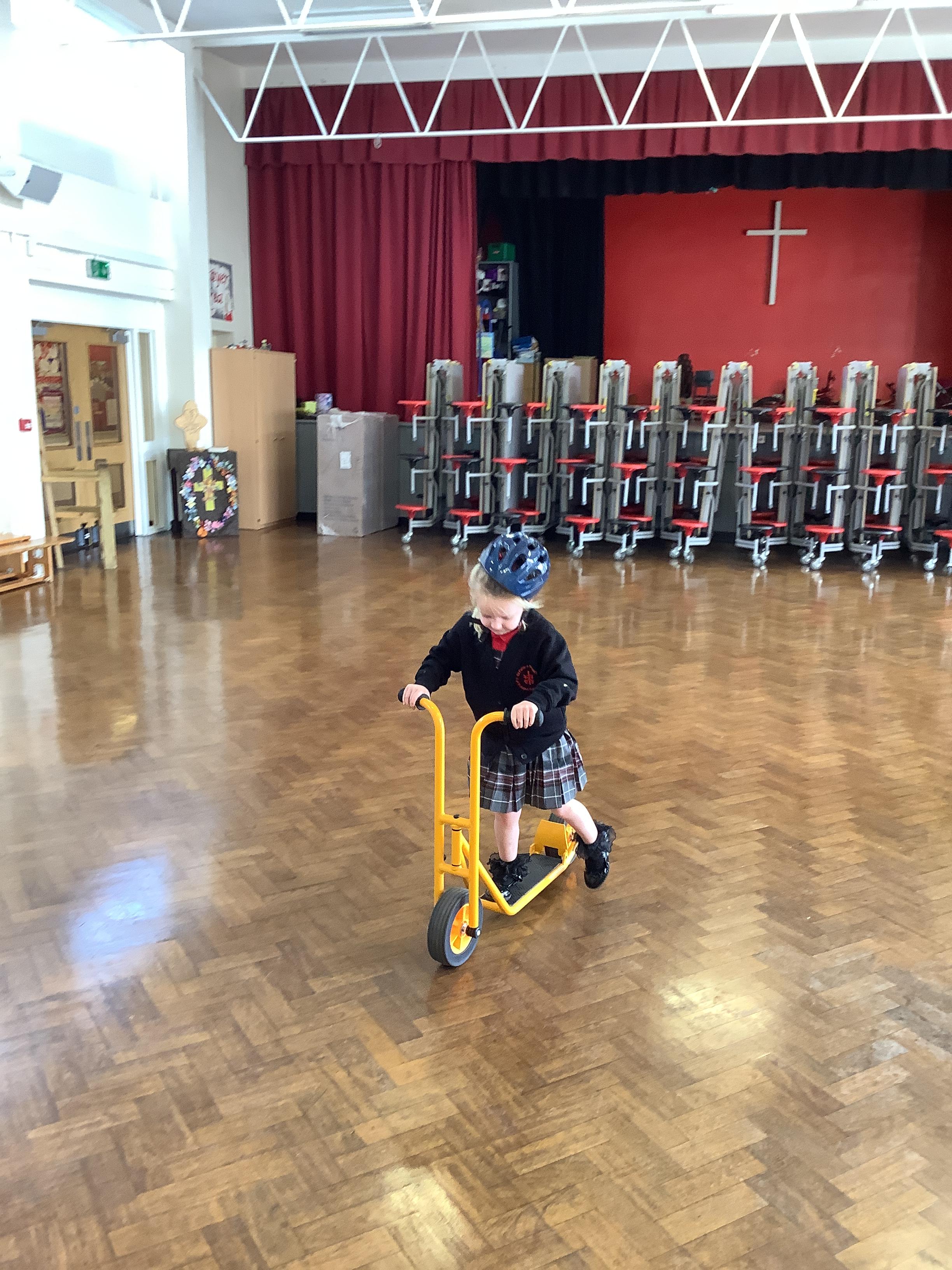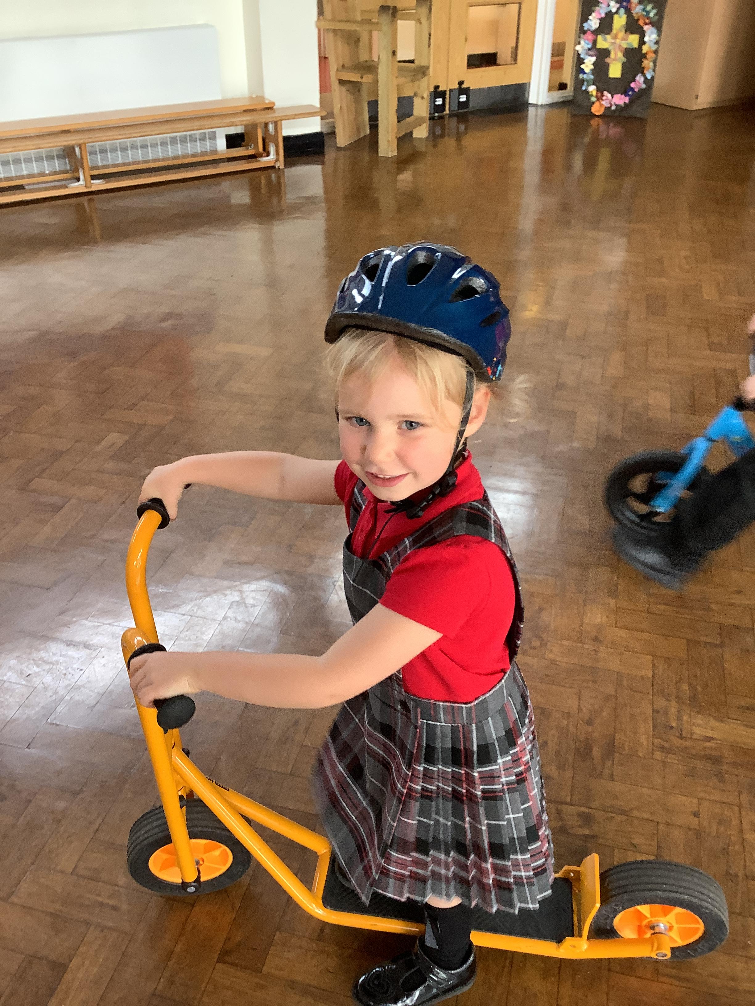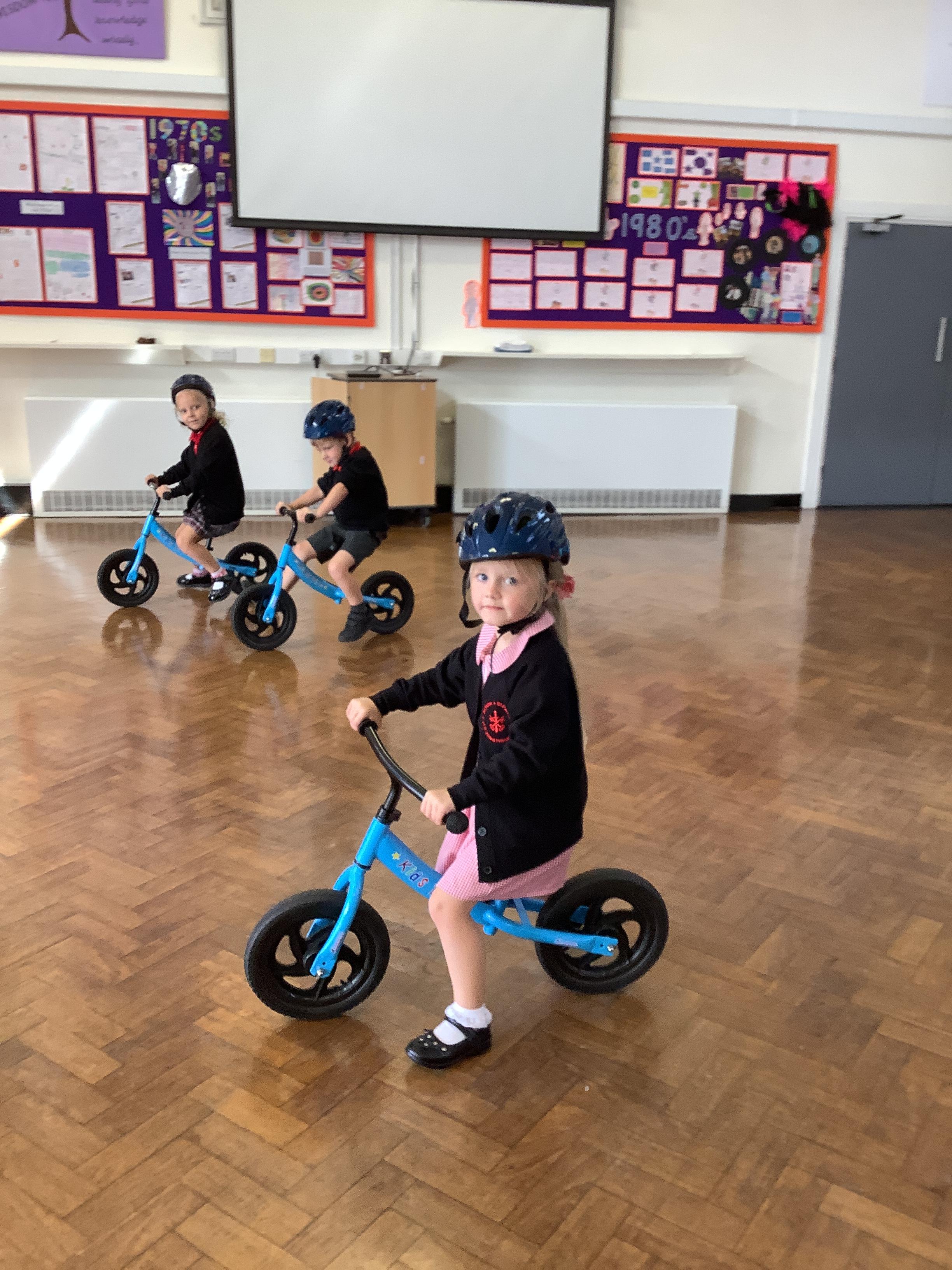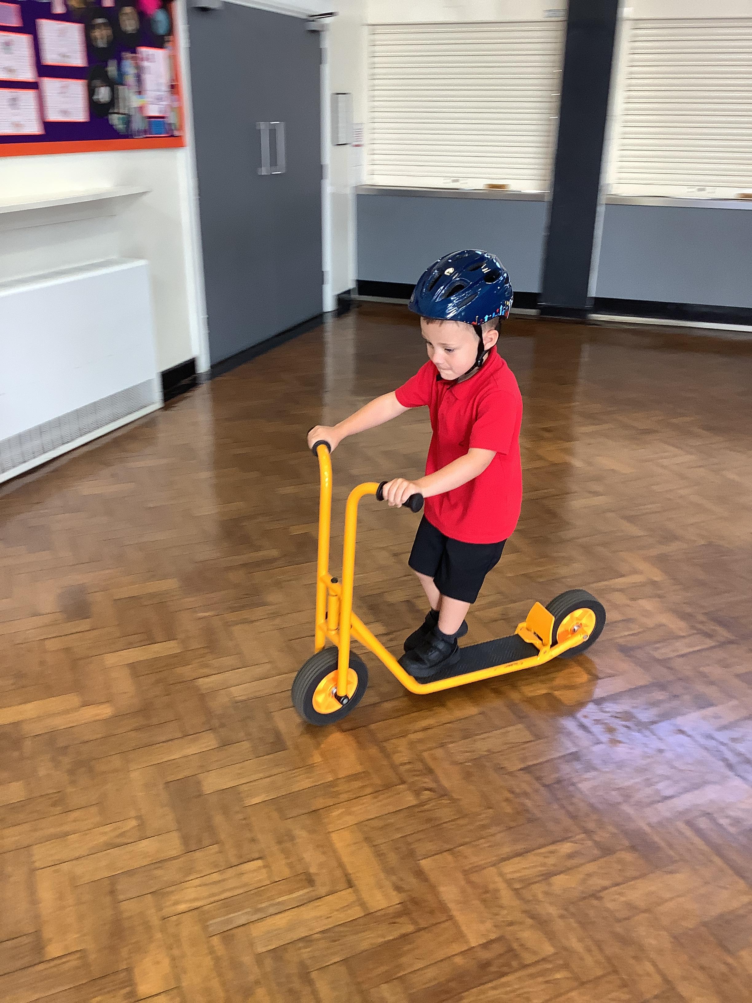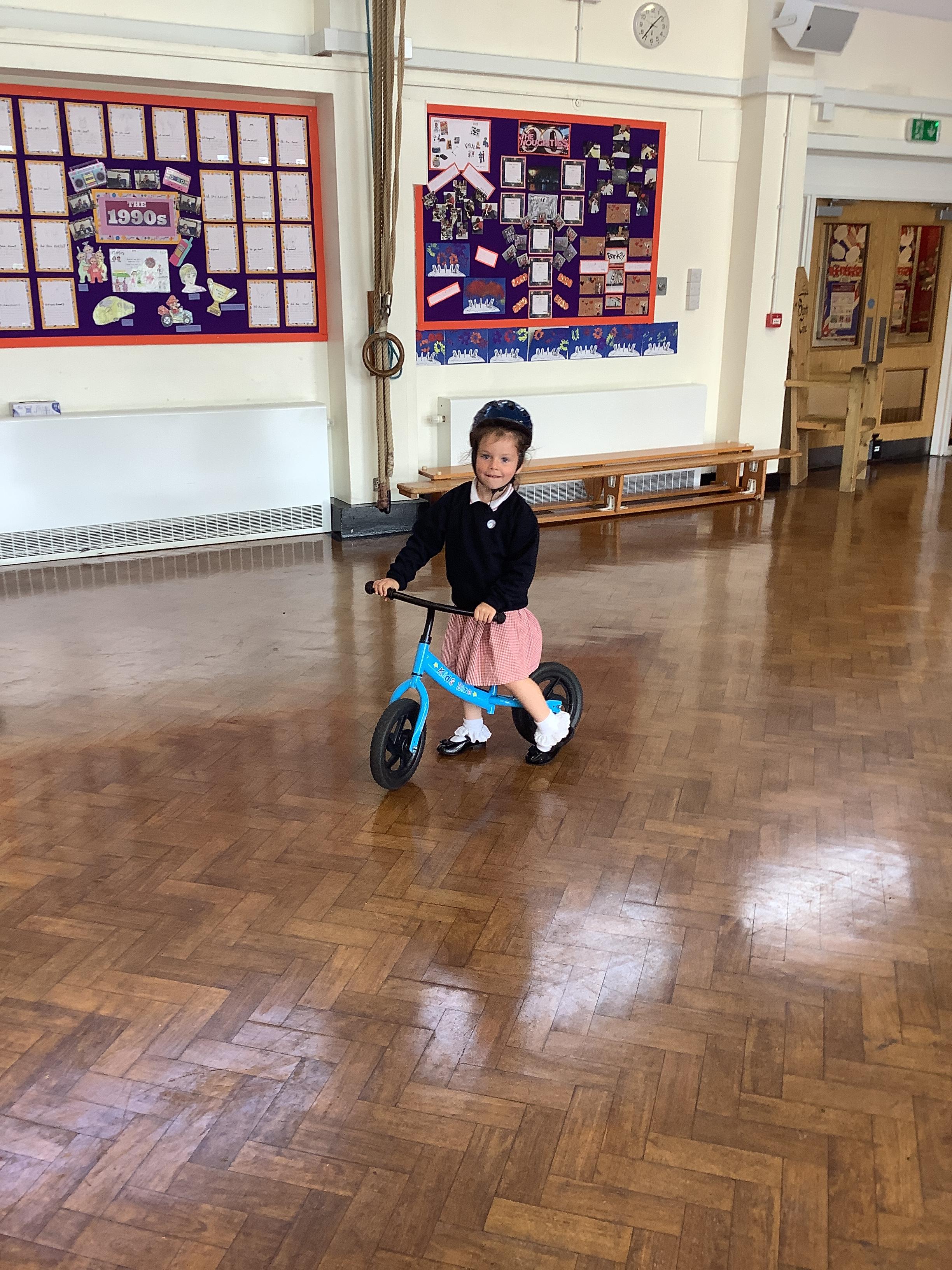 Practising balancing on the bikes and scooters.