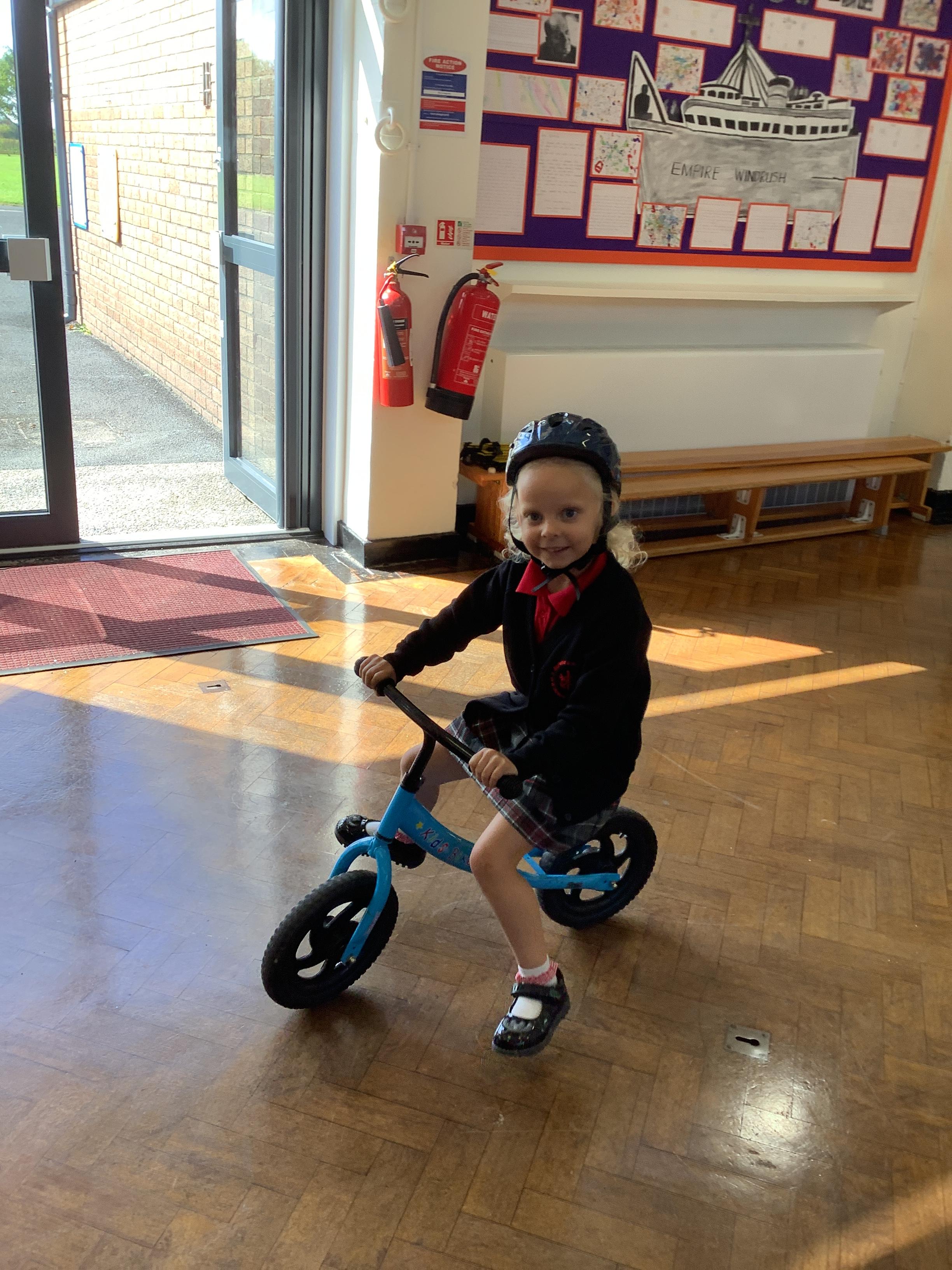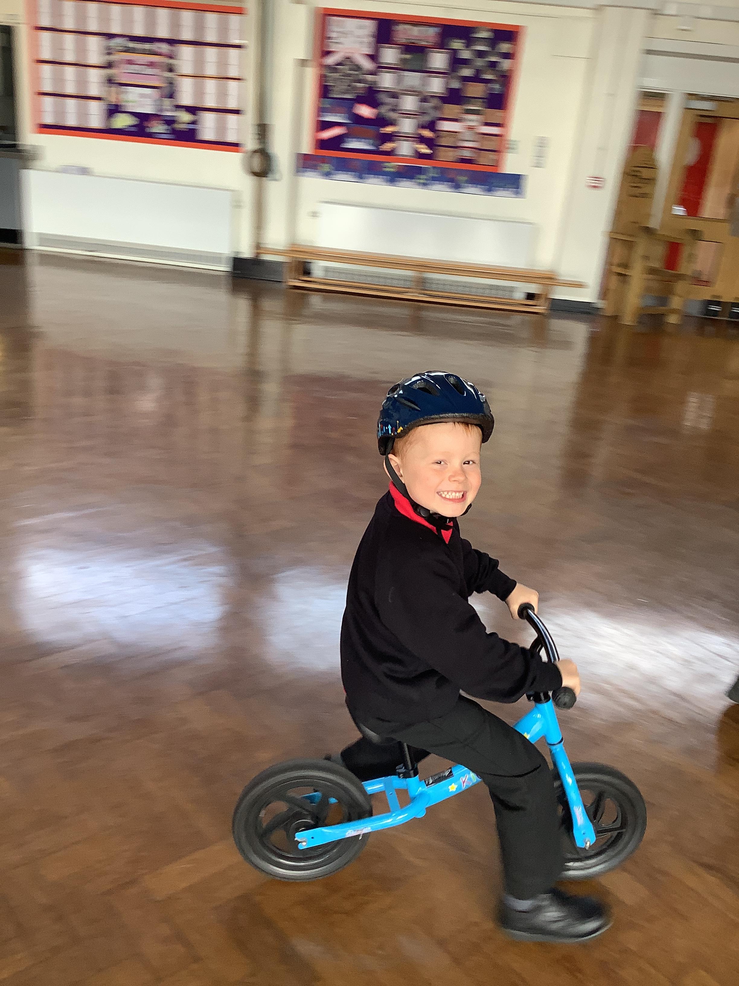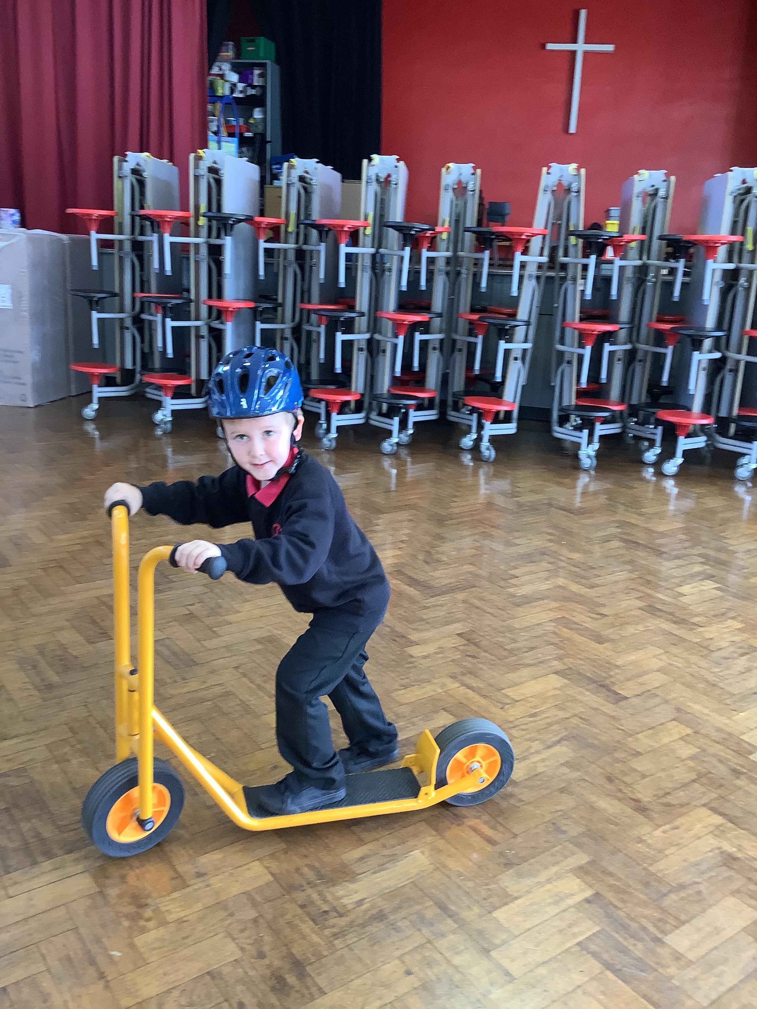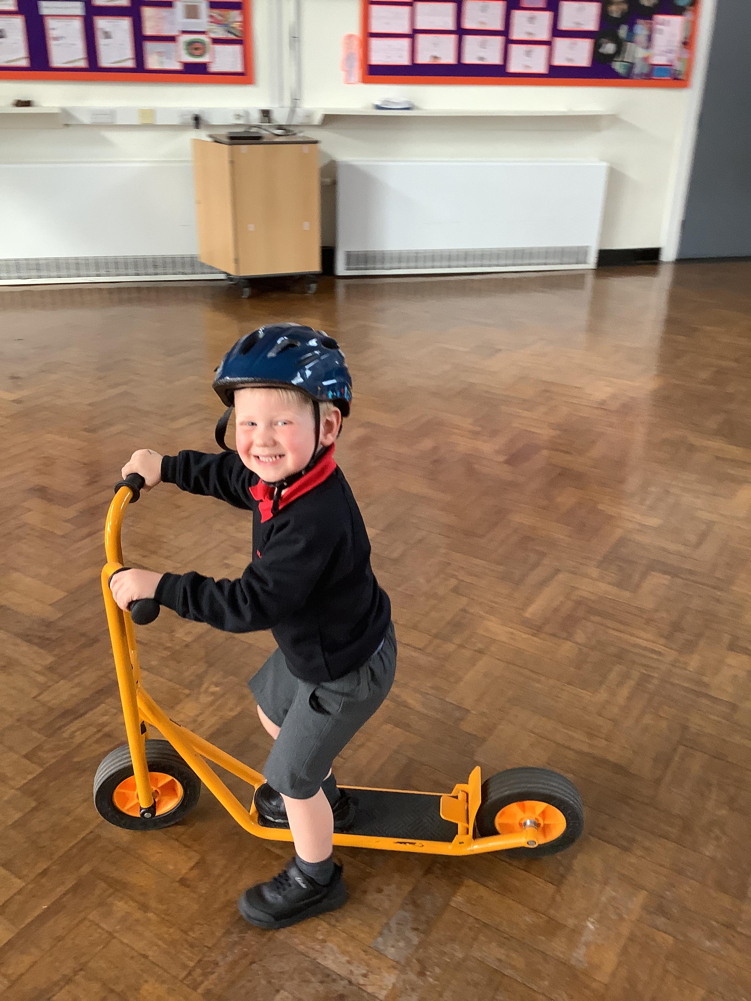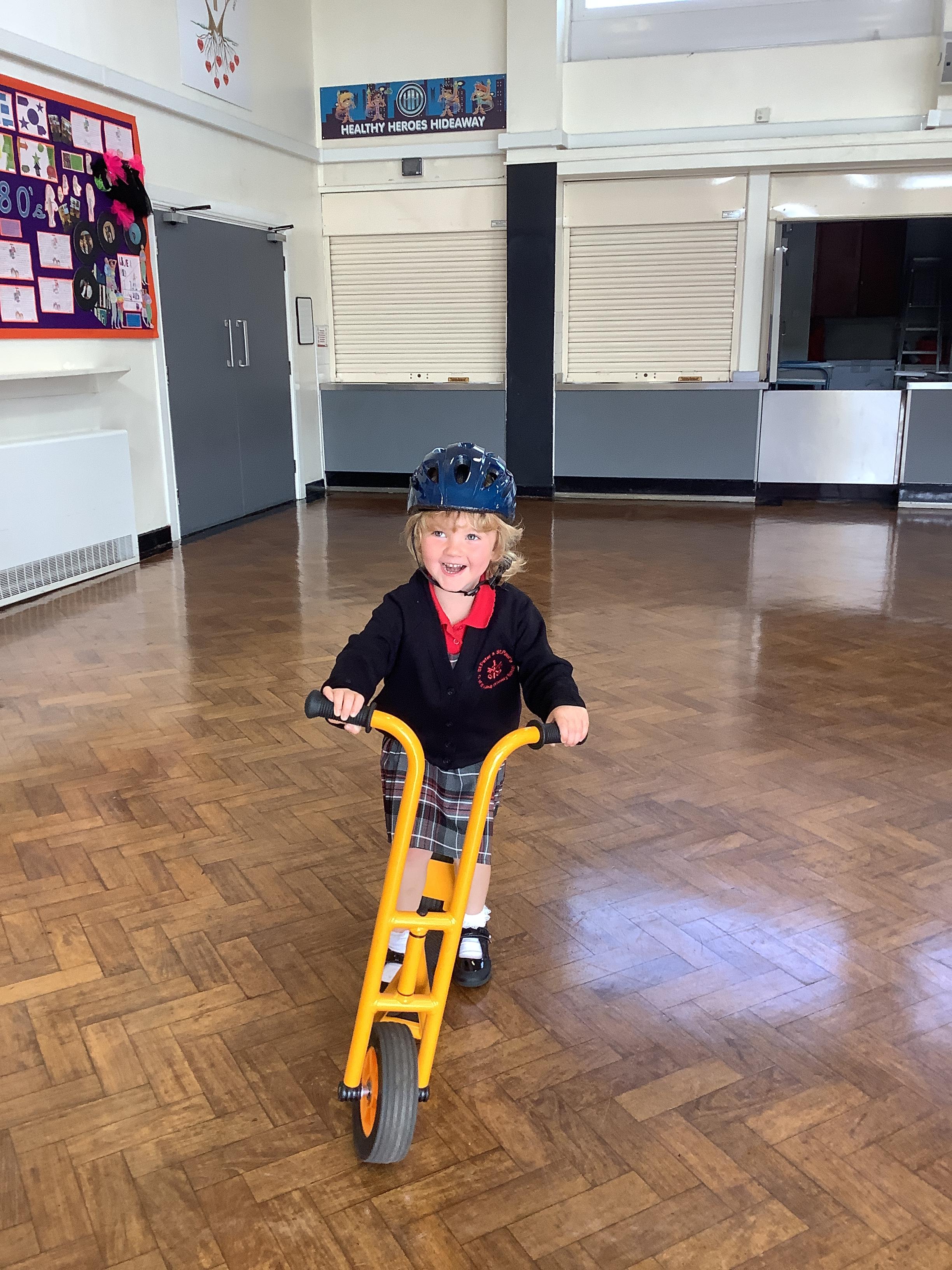 Practising balancing on the bikes and scooters.